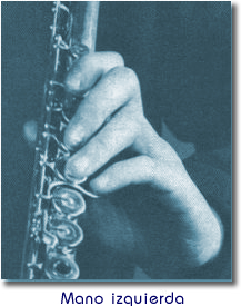 Esta es una tabla simple y clara de las posiciones de las notas en la flauta traversera. Un consejo para los principiantes. Una vez que logréis emitir sonidos utilizando solamente el cabezal, es mejor comenzar con las notas de la octava media, partiendo desde el sol. Aunque las notas de la octava grave parecen mas fáciles en un principio, luego resulta problematico emitir las otras dos octavas. Al comienzo, es aconsejable emitir todas las notas por separado para obtener una cierta precisión, esto se logra con un golpe de lengua igual al necesario para pronunciar la consonante "t". Otro pequeño consejo para las posiciones. Los principales punto de apoyo de la flauta son: el mentón, el pulgar izquierdo y el pulgar derecho. Los agujeros de las llaves deben cerrarse con la yema de los dedos. Además, conviene tener los brazos un poco separados del cuerpo para dejar libre la caja toráxica cuidando de no alzar las espaldas |