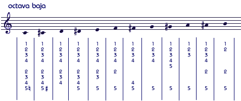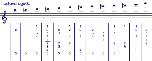 En las tablas siguientes los dedos están numerados para cada mano partiendo desde el pulgar del uno al cinco. Para la llave del trémolo denominada "A" se usa el dedo medio, para la "B" el anular. |