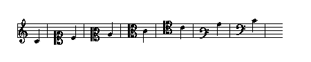 Escala de do mayor no temperada (calculando las relaciones a partir del do). Esta suena extraña a nuestros oídos. El mi y el la son sensiblemente calantes y el do final da la sensación de ser creciente. | |