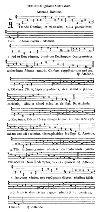 Escucha, Señor y ten misericordia porque hemos pecado contra Ti. A Ti, Rey soberano, Redentor de todos levantamos nuestros ojos en llanto; escucha, Cristo, las plegarias de los que te suplican. Oh diestra del Padre, piedra angular, camino de la salvación y puerta del cielo: lava las manchas de nuestros delitos. Rogamos oh Dios, a tu majestad: con tus oídos santos escucha nuestros gemidos, perdona bondadoso nuestras culpas. Nuestros pecados cometidos los confesamos ante Ti; con corazón contrito te manifestamos lo oculto; que tu clemencia, oh Redentor, nos las perdone. Inocente, fuiste capturado, y llevado sin poner resistencia, y condenado por los impíos con testigos falsos. A los que redimiste, consérvalos Tú, oh Cristo. |